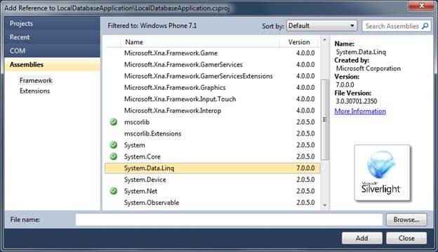 Create a windows phone application by choosing target framework 7.1.After creation of project add reference of System.Data.Linq to the project.
