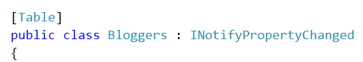 Let us go ahead and decide on database schema and entity of database.. I am going to have table called Bloggers in database. To represent table you need to create an entity class. I am implementing INotifyPropertyChanged interface to support two way binding. However you can choose not to implement and this interface has nothing to do with local database support.