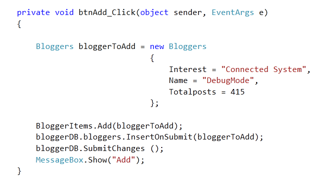 bloggerDB.bloggers.InsertOnSubmit(bloggerToAdd);