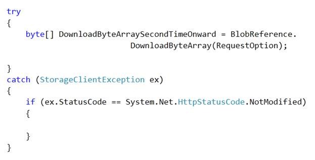 At time of downloading BLOB in above code, server will fist check for the ETatg in IfNoneMatch header. If server don’t find new version, it will send HTTP 304 request to the storage library.