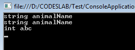 Console.WriteLine(""Animal name is "" + animalName);