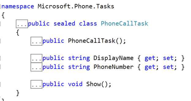 Launchers are used to perform task provided by phone operating system. Making Call is feature of Windows phone operating system and can be used by Launcher API. PhoneCallTask launcher is used to call. This launcher class is defined as below,