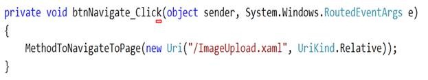 MethodToNavigateToPage(new Uri("/ImageUpload.xaml", UriKind.Relative));