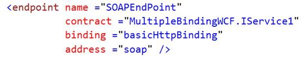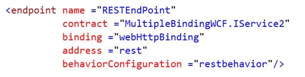 <?xml version="1.0"?> <configuration> <system.web> <compilation debug="true" targetFramework="4.0" /> </system.web> <system.serviceModel> <behaviors> <serviceBehaviors> <behavior name ="servicebehavior"> <serviceMetadata httpGetEnabled="true"/> <serviceDebug includeExceptionDetailInFaults="false"/> </behavior> </serviceBehaviors> <endpointBehaviors> <behavior name="restbehavior"> <webHttp/> </behavior> </endpointBehaviors> </behaviors> <services> <service name ="MultipleBindingWCF.Service1" behaviorConfiguration ="servicebehavior" > <endpoint name ="SOAPEndPoint" contract ="MultipleBindingWCF.IService1" binding ="basicHttpBinding" address ="soap" /> <endpoint name ="RESTEndPoint" contract ="MultipleBindingWCF.IService2" binding ="webHttpBinding" address ="rest" behaviorConfiguration ="restbehavior"/> <endpoint contract="IMetadataExchange" binding="mexHttpBinding" address="mex" /> </service> </services> </system.serviceModel> <system.webServer> <modules runAllManagedModulesForAllRequests="true"/> </system.webServer> </configuration>
