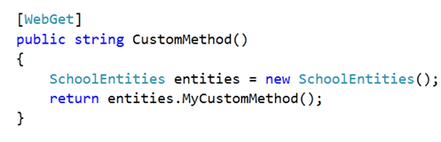 - Add a method with WebGet attribute in service class. This method will make a call to the custom method added in partial entity class.