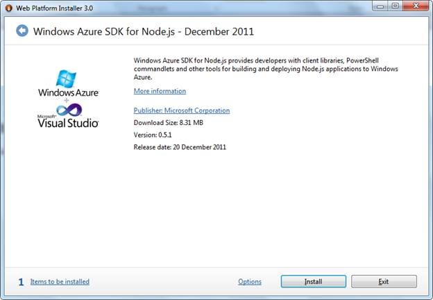 To start with Node.JS on Windows Azure you need to install Windows Azure SDK for Node.JS. You can Get Windows Azure SDK for Node.JS from here. You need to install it from Web Installer. You will get below dialog box to install Windows Azure SDK for Node.JS