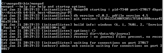 If you would have gone through MongoDB on Windows quick start in 5 minute then you know how to start MongoDB server. However just for quick recap you need to start MongoDB server as below,