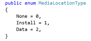 Install represents application installation directory, Data represents isolated storage and None value need to be set for external media.