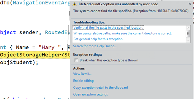 I was working with storing and retrieving structured data in Isolated Storage. While Binging I came across nicely written Generic Object Storage Helper for WinRT . This is written by Jamie Thomson . When I tried using this utility I came across an exception. I tried to store object of Student as following.