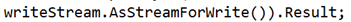 Stream outStream = Task.Run(() => writeStream.AsStreamForWrite()).Result;