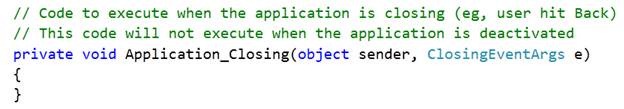 An Application gets closed by pressing hardware back button. And in that case application neither goes to dormant state or tombstone state. If there are multiple pages in application then user navigates between pages using hardware back button. However if on start page of application user press hardware back button then operating system will close the application. While closing application Application_Closing() events gets executed.