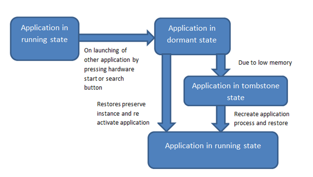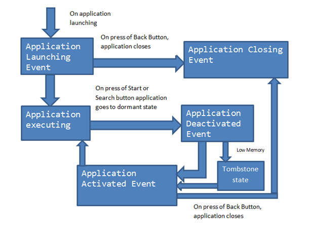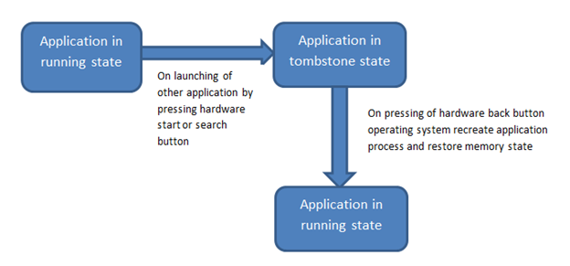 Application life cycle of Windows Phone application says about different state of the application from launching to closing. User launches an application and application goes to running state. Due to launching of other application or on pressing of hardware start or search button application goes to dormant or tombstone state. Again on the launching of application, app gets activated from either dormant or tombstone state. Application can be closed by pressing of hardware back button.
