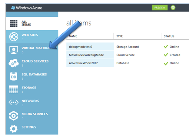 In this post we will walkthrough step by step to create Virtual Machine in Windows Azure. To start with very first you need to login to Windows Azure Management Portal here and then click on Virtual Machines option in left panel.