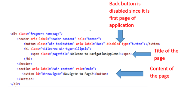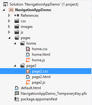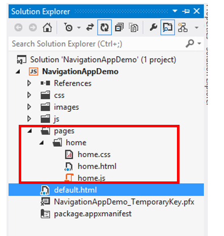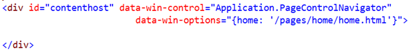 Let us stop at this point to explore default.html. In default.html you will find there is a PageControlNavigator. This control will host all the pages. Essentially Navigation Application Template follows singe page navigation mechanism. You will notice in data-win-option that there is home parameter and it is set to a page.