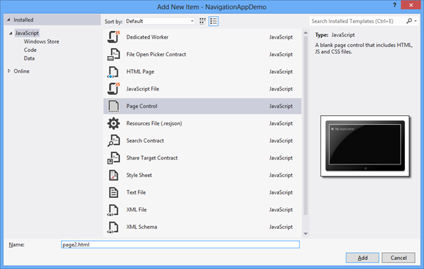 Let us say you want to navigate to Page2.html on click or touch of button. For that very first task you need to do is to add Page2.html in the project. For that right click on the pages folder and add a new subfolder called page2. Then right click on the newly added subfolder page2 and add a new item. Choose Page Control to add as new item.