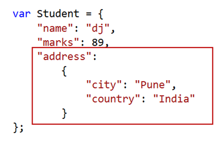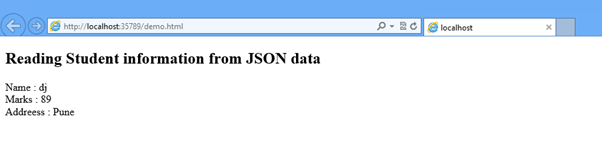 <body> <h2>Reading Student information from JSON data</h2> Name : <span id="namespan"></span> <br /> Marks : <span id ="marksspan"></span><br /> Addreess : <span id="addresssapn"></span> <br /> </body>