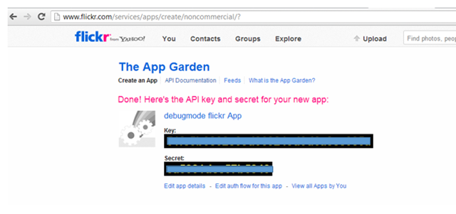 To create on Flickr based application you need API Key from Flickr. You can apply for API key here . You need to fill the required information and click on Submit button to create API key. We need this API key in application. You need to submit App information in order to generate key. After submitting app information you will be navigated to App Garden and there you will find APP key and secret key as given in below image.