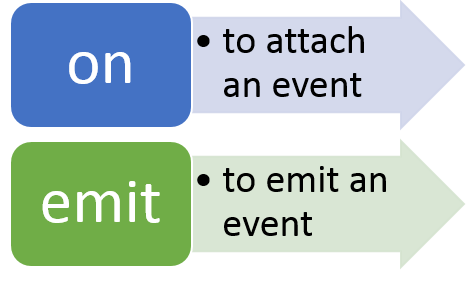 You can attach an event using on event handler. You can emit an event using emit event handler.