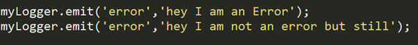 You can add an event as follows. As you see there are two parameters. ‘error’ is name of the event and errorFunction is function called when error function emits on myLogger.
