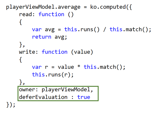 Before we end this post let us discuss one more concept of deferred execution of computed observable. As we discussed in beginning of this post that computed observable get evaluated at time of creation. So if it is based on observable which is not loaded at time of creation of computed observable then you might run into problem. KO gives you option to deferred execution of computed observable. You can do that by setting deferEvaluation value to true