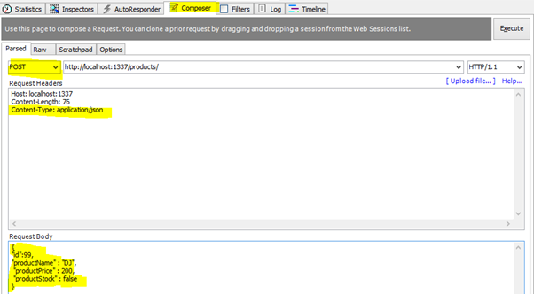 Next let us use fiddler to perform POST, PUT and DELETE. To perform POST or create a product select Composer, from drop down select POST operation. Set URL, set Content-Type and in Request-Body construct a JSON to add as product.