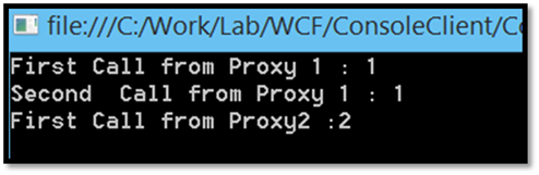 We are calling both services with different proxy but at the service side single service instance is getting created. As an output each time you will get increased value of counter from the service. So we can conclude that single instance of service is being used by all proxies at clients.