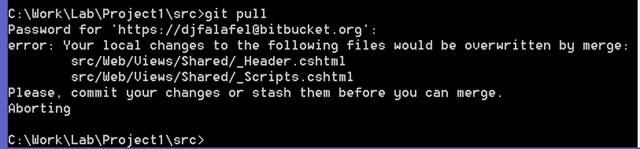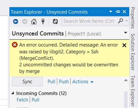 You get the above shown error in Visual Studio while pulling changes from the git server. This error causes because you have local changes without the commit. In this scenario the visual Studio does not give very readable error message. Perhaps you may want to use git command for pull for more information on the error.
