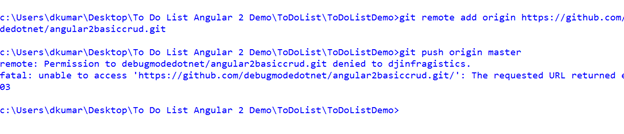 Yes, this was a strange scenario for me. I created Angular 2 project in Visual Studio Code and wanted to push the project into a GitHub Repository. Sounds a simple requirement right? So to publish the project to a GitHub Repository, I ran following 5 commands in the order given below: