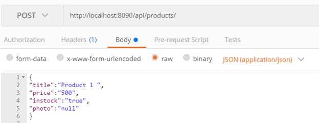 Now your API is running on the port 8090. To test the API, open POSTMAN and perform a POST operation on URL baseurl/api/products.