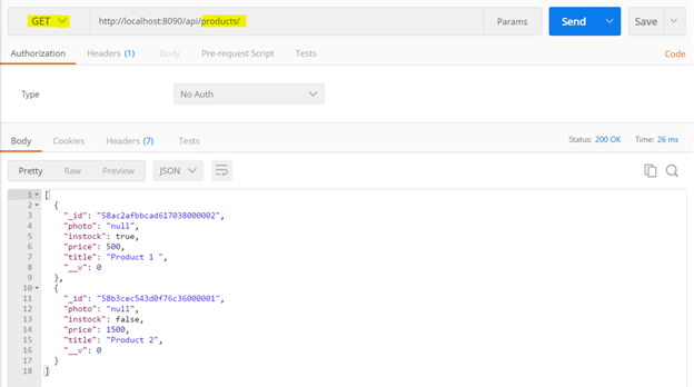 The above route will be called, whenever client will perform HTTP GET operation on baseurl/api/products. To test API, open POSTMAN and perform a GET operation on URL baseurl/api/products.