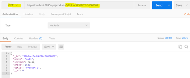The above route will be called, whenever client will perform HTTP GET operation on baseurl/api/products/{product_id}. To test API, open POSTMAN and perform a GET operation on URL baseurl/api/products/{product_id}.