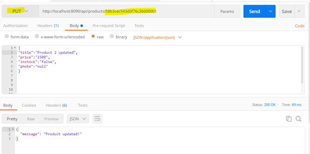 The above route will be called to update a particular product, whenever the client will perform HTTP PUT operation on baseurl/api/products/{product_id}. To test API, open POSTMAN and perform a PUT operation on URL baseurl/api/products/{product_id}. You need to pass product object to be updated in the body of the request as shown in the image below: