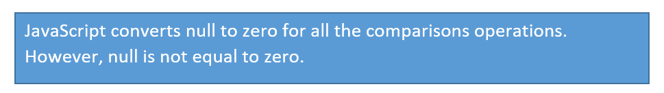 JavaScript treats null as zero for comparisons. However, keep in mind null is not equal to zero. Try performing below operations :