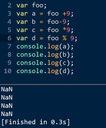 As output, JavaScript will evaluate all operations to NaN as shown in the image below: