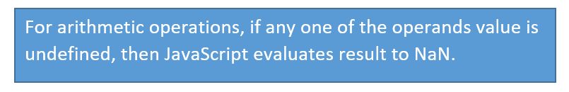 Therefore, if any of the operand is undefined then JavaScript evaluates arithmetic operation to NaN.