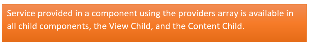 Above, you have set both providers and viewProviders array for Child1Component. The viewProvider allows us to make providers available only for the component’s view, and it would not be available to the content children.
