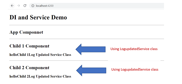 Now when you run the application, you find an object of LogupdatedService is passed to both the components.