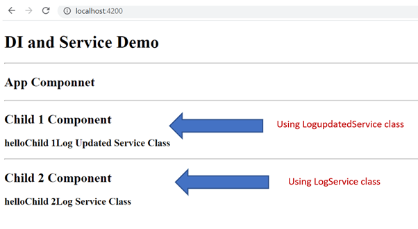 Here Child2Component is a Content Child of Child1Component. As of now, Child1Component and Child2Component both are using LogService.