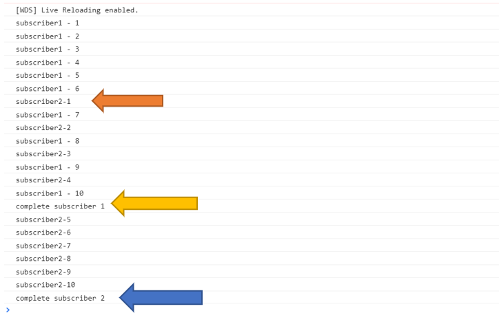 observable.subscribe( data => { console.log('subscriber1 - ' + data); }, null, () => { console.log('complete subscriber 1'); } ) const observer2 = { next: (data: any) => console.log('subscriber2-' + data), error: (err: any) => console.log(err), complete: () => { console.log('complete subscriber 2') } } setTimeout(() => { observable.subscribe(observer2); }, 5000);