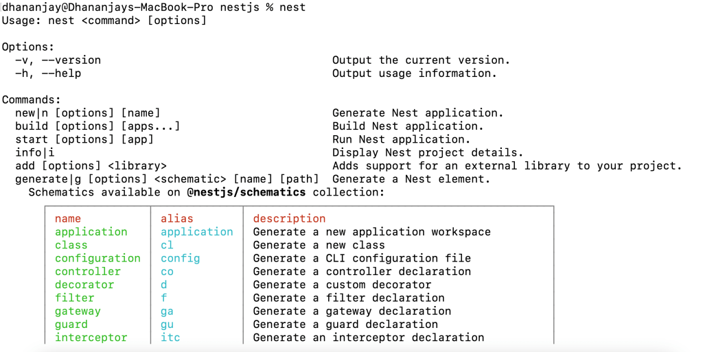 To validate whether Nest CLI is successfully installed, run the command nest in the terminal, and you should get the following output.