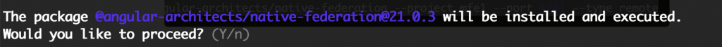 Make sure to pass your project name after the --project flag (in this case, remote-app1). The CLI will then prompt you to confirm. After that, it will run the schematics and configure the Angular project as a remote application.